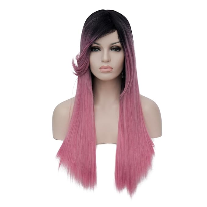 Yiyaobess Middium Long Black Pink Ombre Wig Cosplay Synthetic Hair